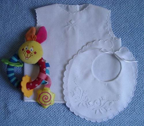 Il mio terzo corredino nascita è a punto ombra, con un motivo semplice ma grazioso che avevo già usato per un'abitino di Anita, in occasione del battesimo di Mario. Cercavo ispirazione e, come nei film, il ritaglio del disegno è scivolato dalle pagine di un libro svolazzando. Io ci ho voluto vedere subito un segno del destino, risolvendo il problema. Purtroppo la fonte non è precisa: credo di averlo tratto da un album di decalcabili di Mani di Fata.