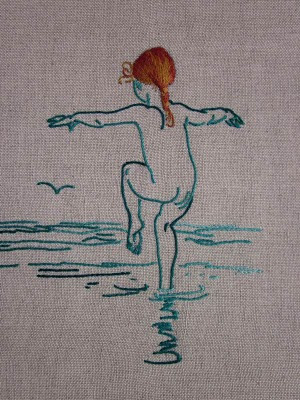 Avevo trovato questo disegno nel repertorio di Flickr che ho citato spesso e mi è piaciuto perchè è di per sè poetico e perchè il profilo della bambina mi ha subito ricordato Anita, a cui è dedicato l'album. Il precedente ormai era colmo di disegni e ne volevo realizzare un'altro, giusto prima di partire per il mare: niente di meglio di questo soggetto, dunque. Per il ricamo a punto erba ho usato un filo sfumato "Ljubica" ,che mi è stato regalato in occasione del corso a luglio. Ho sempre evitato di comprare marche diverse da DMC e Anchor, ma voglio rilevare che ho piacevolmente apprezzato la sensazione vellutata dei fili di questo mulinè, che apparentemente sembrano più sottili di quelli DMC. Non posso però garantire sulla tenuta dei colori perchè non ho lavato il lavoro.
