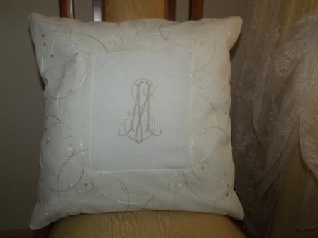 Già. Un anno fa regalai a MS una tenda e oggi, sempre per il suo compleanno, aggiungo il cuscino che ho realizzato recuperando il campione su cui provai il monogramma e i ritagli della tela per la sovratenda.