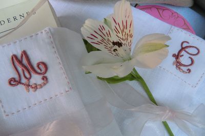 Le fasce avvolgi-libri sono realizzate su lino bianco con iniziali a punto pieno che ho già usato in un' altra occasione.